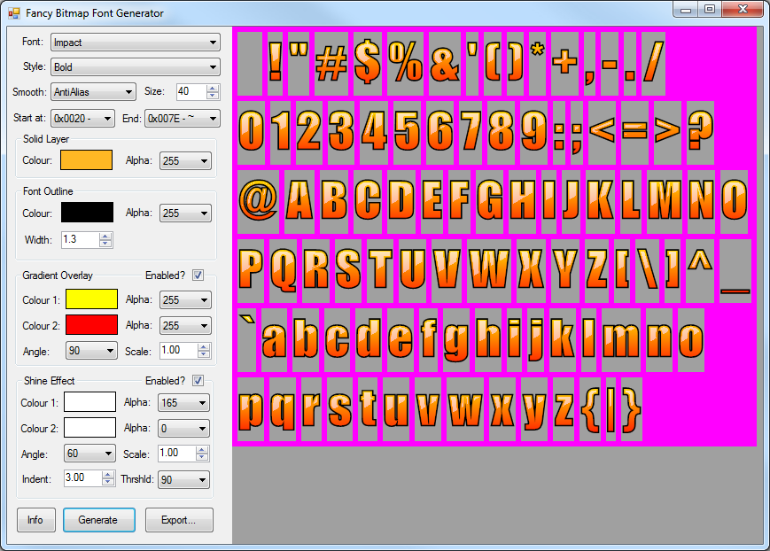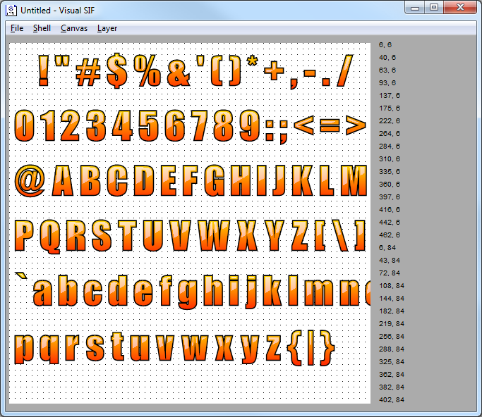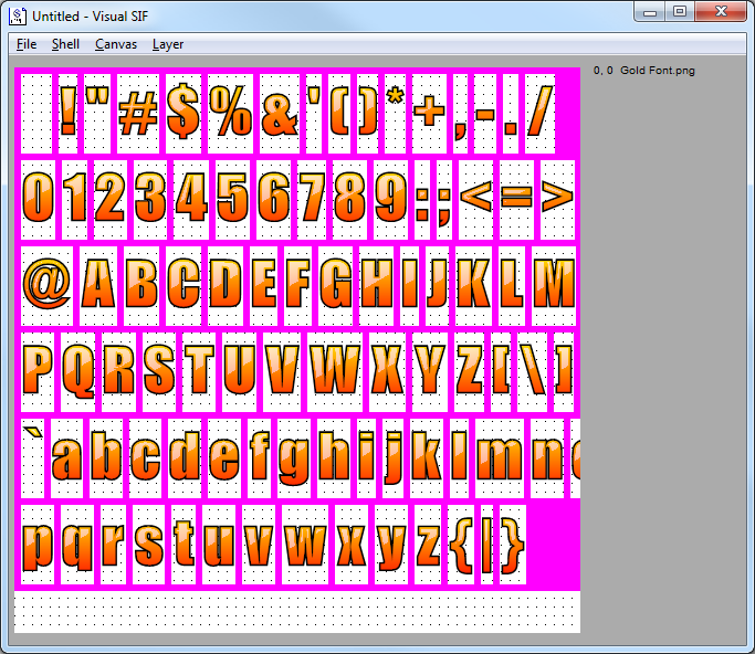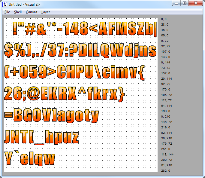 One day I decided I needed a solution for drawing text into an OpenGL scene.  I also needed fonts, and I happened across the Fancy Bitmap Font Generator.  After generating a bitmap font, I updated my Visual SIF application to cut out the individual pieces of the font and arrange them in a space-efficient layout.