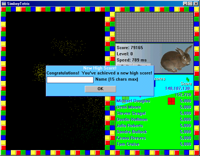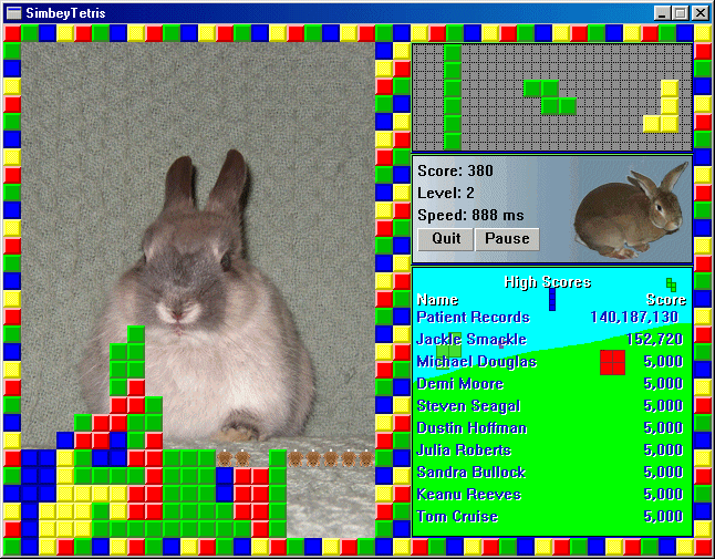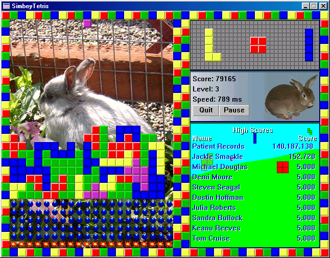 If you enjoy Tetris, you may enjoy playing Bunny Tetris! The game play actually feels quite a bit different from the more conventional Tetris clones, so it's worth a try regardless of how much you love or hate other Tetris clones.Simbey's Bunny Tetris runs on anything with DirectDraw. Windows 98 and newer should run it fine. Click here to download Bunny Tetris.